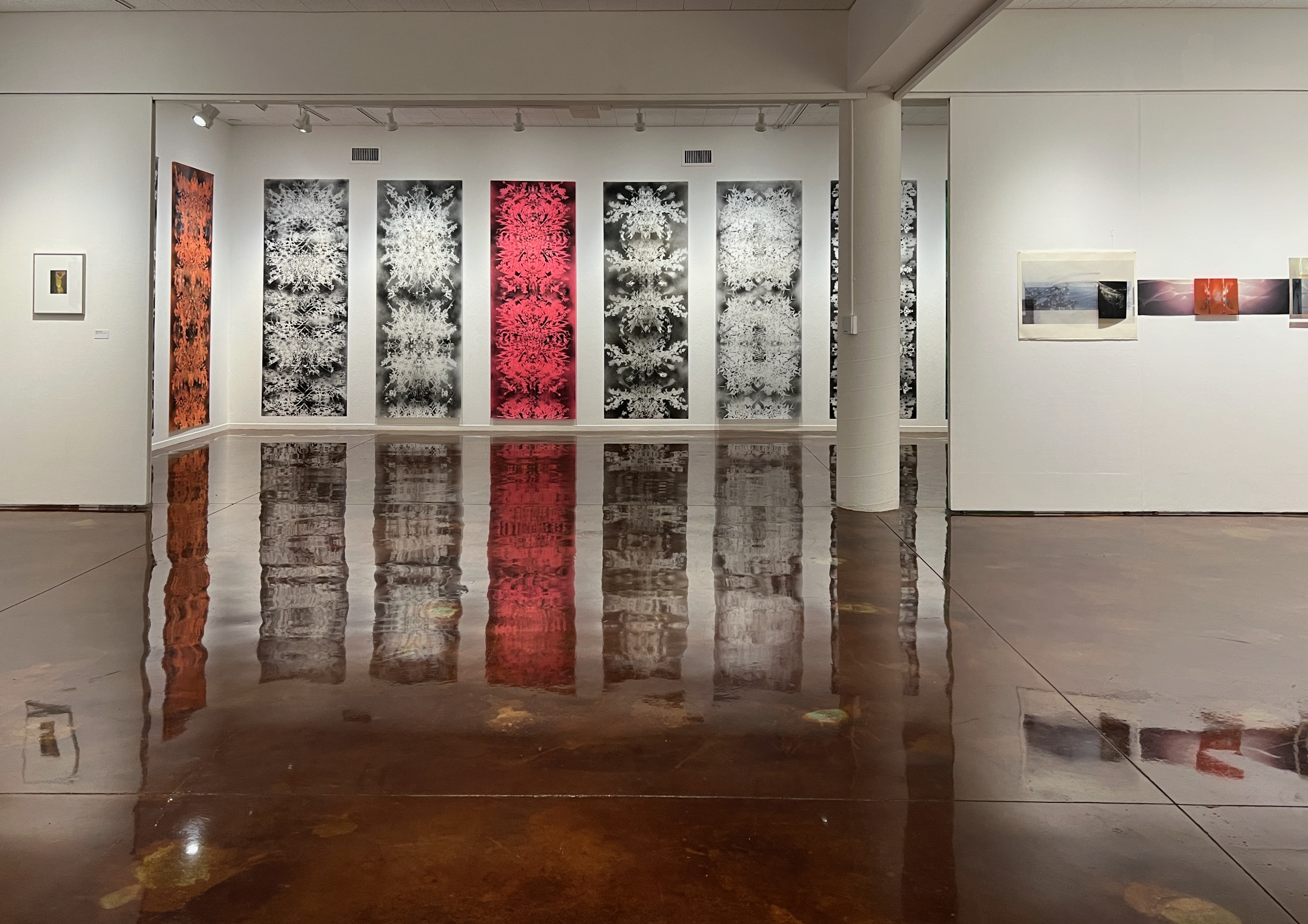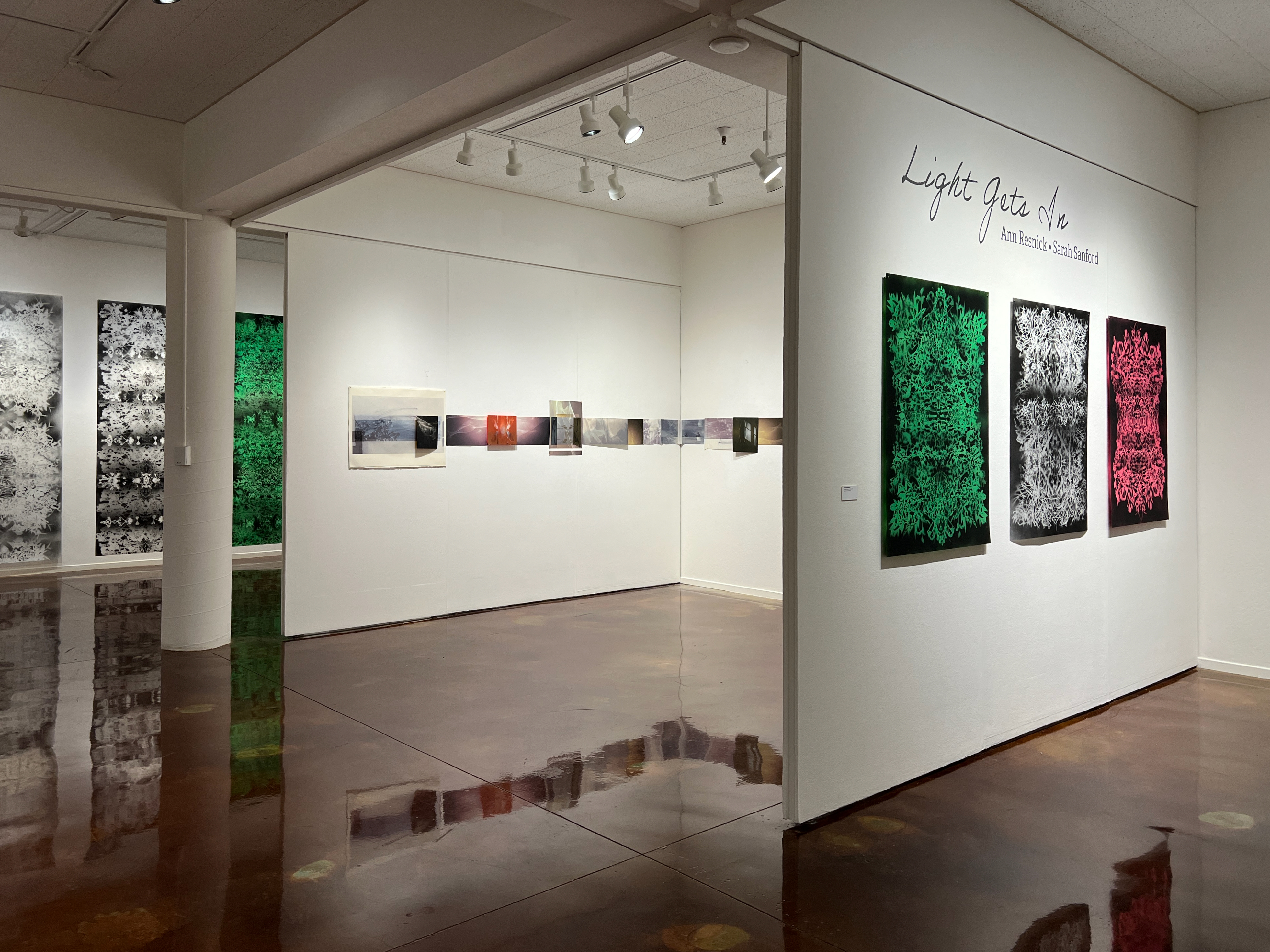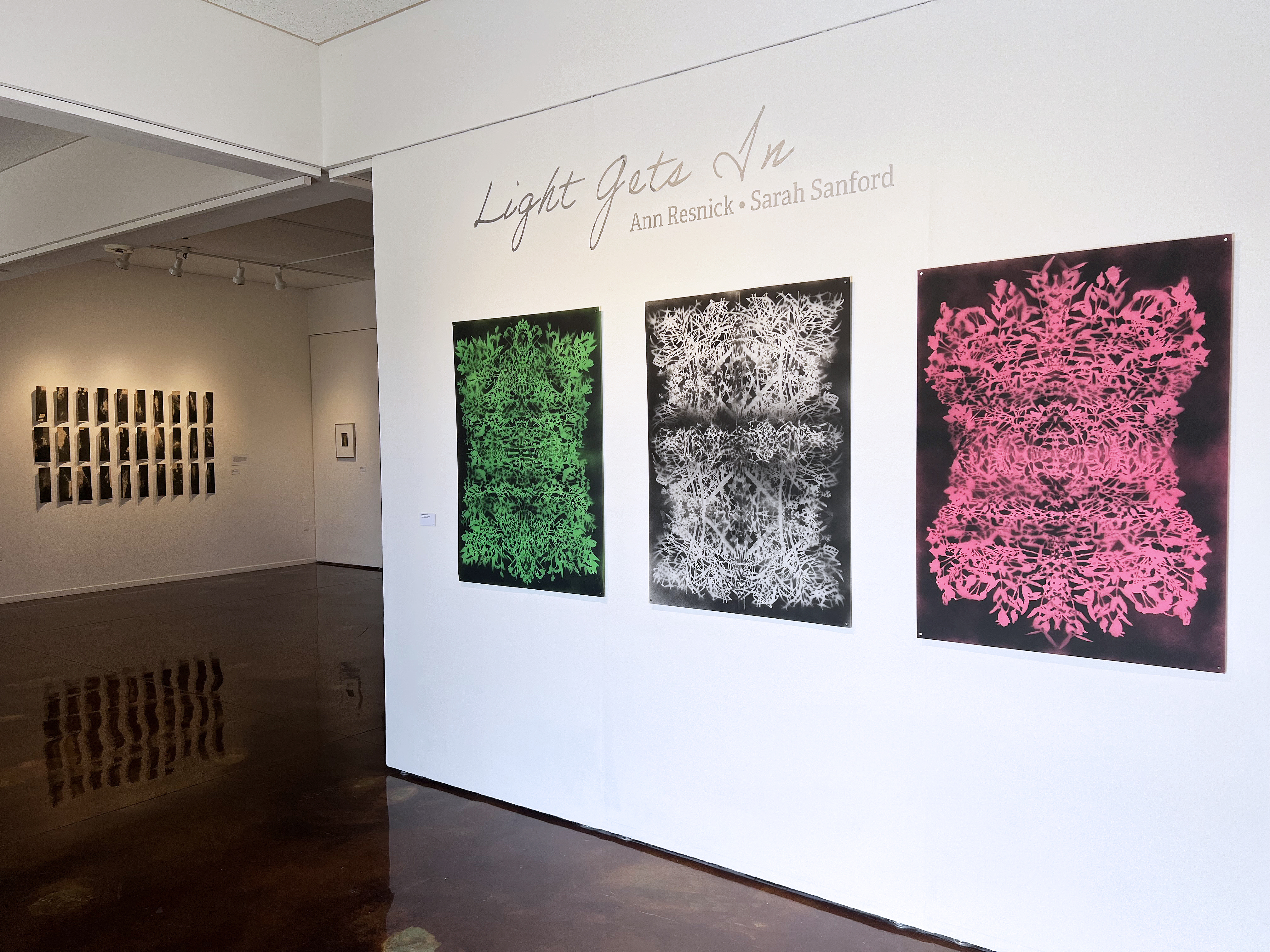 Ann Resnick and Sarah Sanford capture the ethereal and transient properties of light through the use of materials such as reflective inks, powdered and sprayed pigments and translucent surface materials, pushing past the two-dimensional surface and inviting the viewer to engage with visual ambiguity. Their works are abstracted visual reminders of life’s uncertainties. They are mysteries to unravel, inviting rumination and reflection on our complex existence.