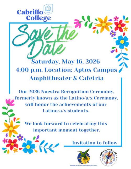 The Nuestra Recognition Ceremony is a cultural ceremony to celebrate the accomplishments of Cabrillo Latinx/a/o/e students who graduated in Fall 2025 and students expected to graduate in Spring and Summer 2026. It is a bilingual and bicultural celebration where familia, friends, and community members come together to honor graduating Latinx/a/o/e students.