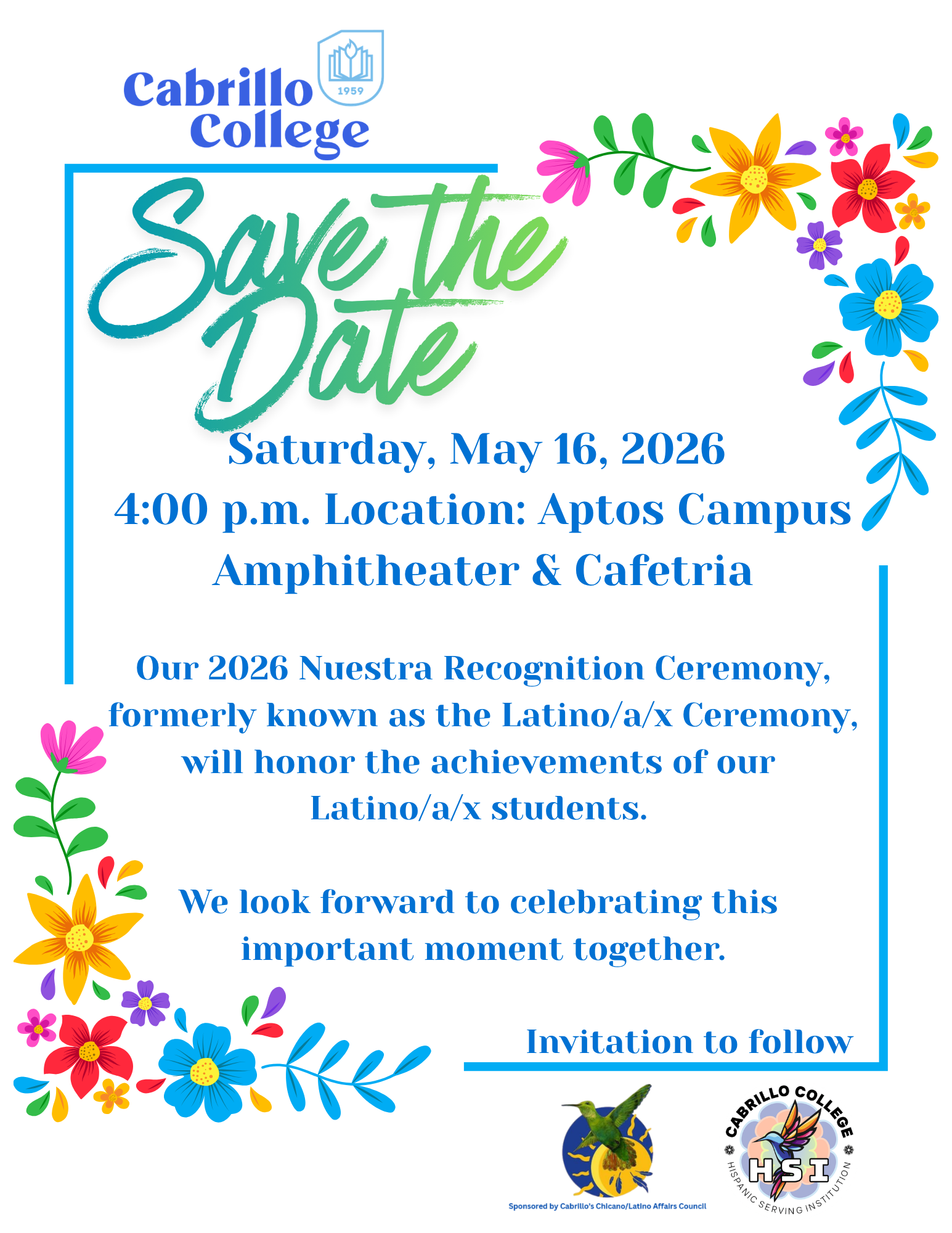 The Nuestra Recognition Ceremony is a cultural ceremony to celebrate the accomplishments of Cabrillo Latinx/a/o/e students who graduated in Fall 2025 and students expected to graduate in Spring and Summer 2026. It is a bilingual and bicultural celebration where familia, friends, and community members come together to honor graduating Latinx/a/o/e students.