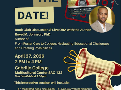 Dr. Royel Johnson will be joining us on April 27, 2026 in the Multicultural Center from 2-4pm to discuss the book From Foster Care to College: Navigating Educational Challenges and Creating Possibilities. This event includes a facilitated book club discussion, author insights and reelections, and a book signing (while supplies last. Food will be provided.