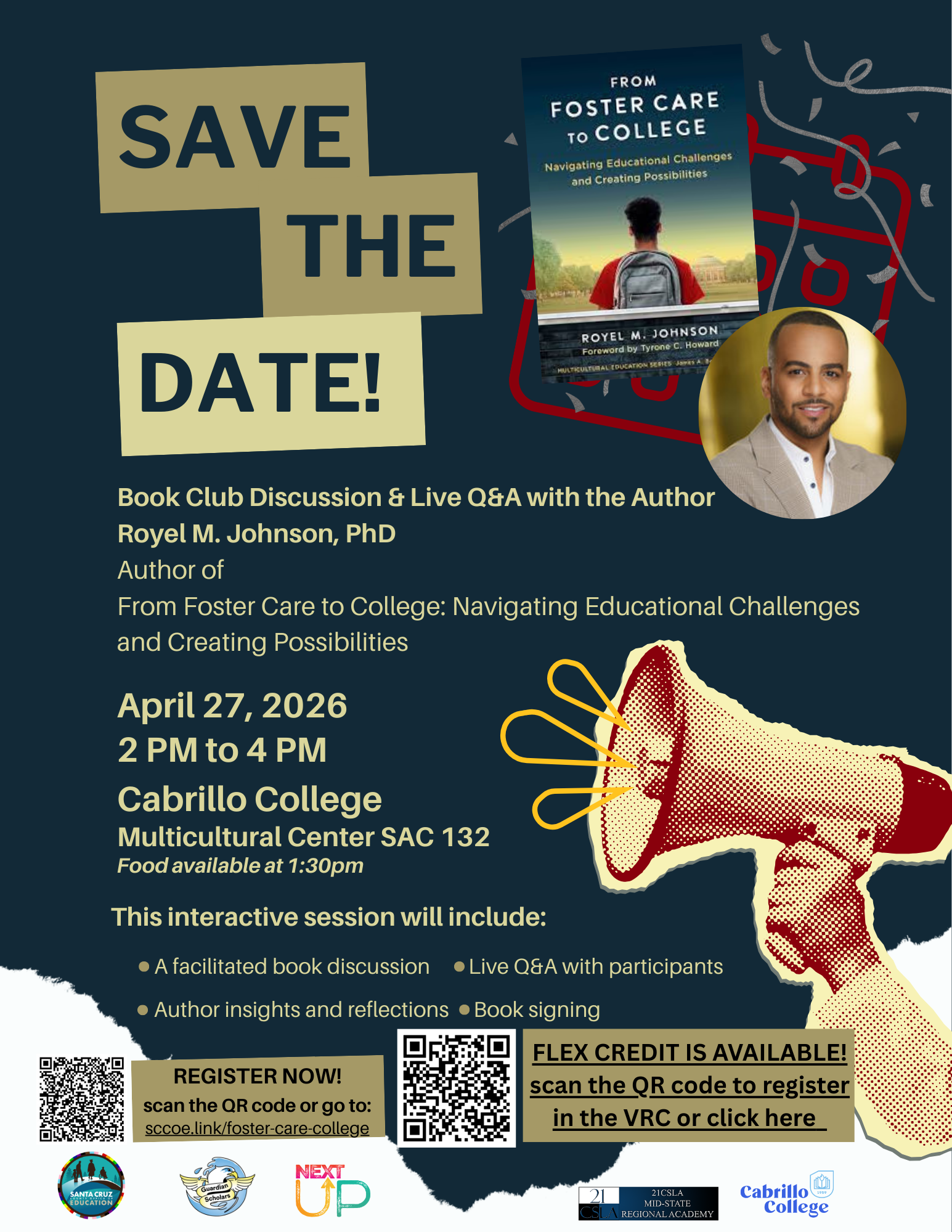 Dr. Royel Johnson will be joining us on April 27, 2026 in the Multicultural Center from 2-4pm to discuss the book From Foster Care to College: Navigating Educational Challenges and Creating Possibilities. This event includes a facilitated book club discussion, author insights and reelections, and a book signing (while supplies last. Food will be provided.