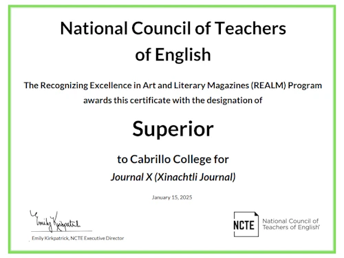 La revista Xinachtli (Journal X) tiene como objetivo dar voz a temas de justicia social. Aceptamos cuentos cortos, memorias breves, obras de teatro y guiones cortos, ensayos breves, poesía, arte y fotografía. Fomentamos las propuestas experimentales. Se aceptan envíos en inglés, español o spanglish, de octubre a enero. (Consulte a continuación las pautas de envío).
