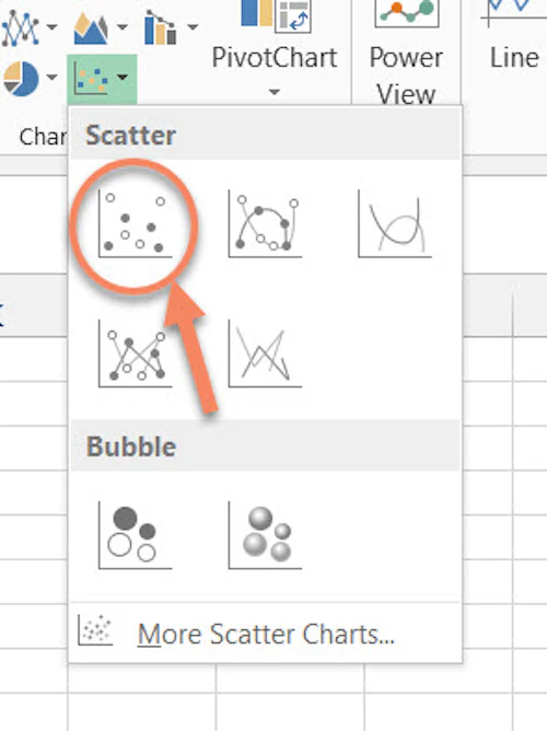 En la pestaña Insertar, seleccione gráficos y haga clic en Dispersión (X,Y).