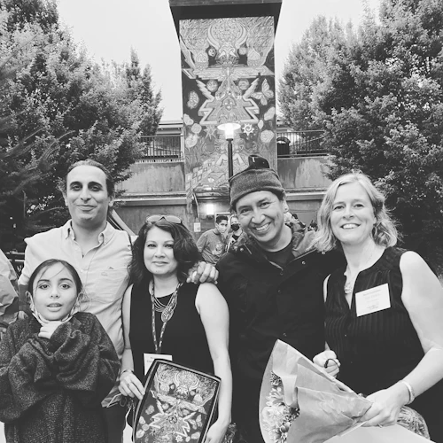 Me asusté mucho y dejé de pintar graffiti, pero afortunadamente uno de los padres de mi compañero de graffiti era un legendario muralista del movimiento artístico mural chicano. Me presentó a él, Guillermo Aranda, y después de conocerlo nos conectamos profundamente a través de la identidad e historia indígena. Me tomó bajo su ala como aprendiz donde asistí en la pintura de murales en escuelas locales. Desde entonces sabía que el muralismo/pintura era lo que quería hacer por el resto de mi vida. Me comprometí a estudiar la historia y forma artística del muralismo enfocándome en frescos precolombinos y su evolución actual. En este proceso tuve la oportunidad de conocer y colaborar con algunos de los legendarios y originales colectivos murales del movimiento chicano: El Chicano Royal Air Force de Sacramento, Tortuga Border Patrol de Santa Cruz y costa central, y Toltecas en Aztlan desde el área de San Diego.