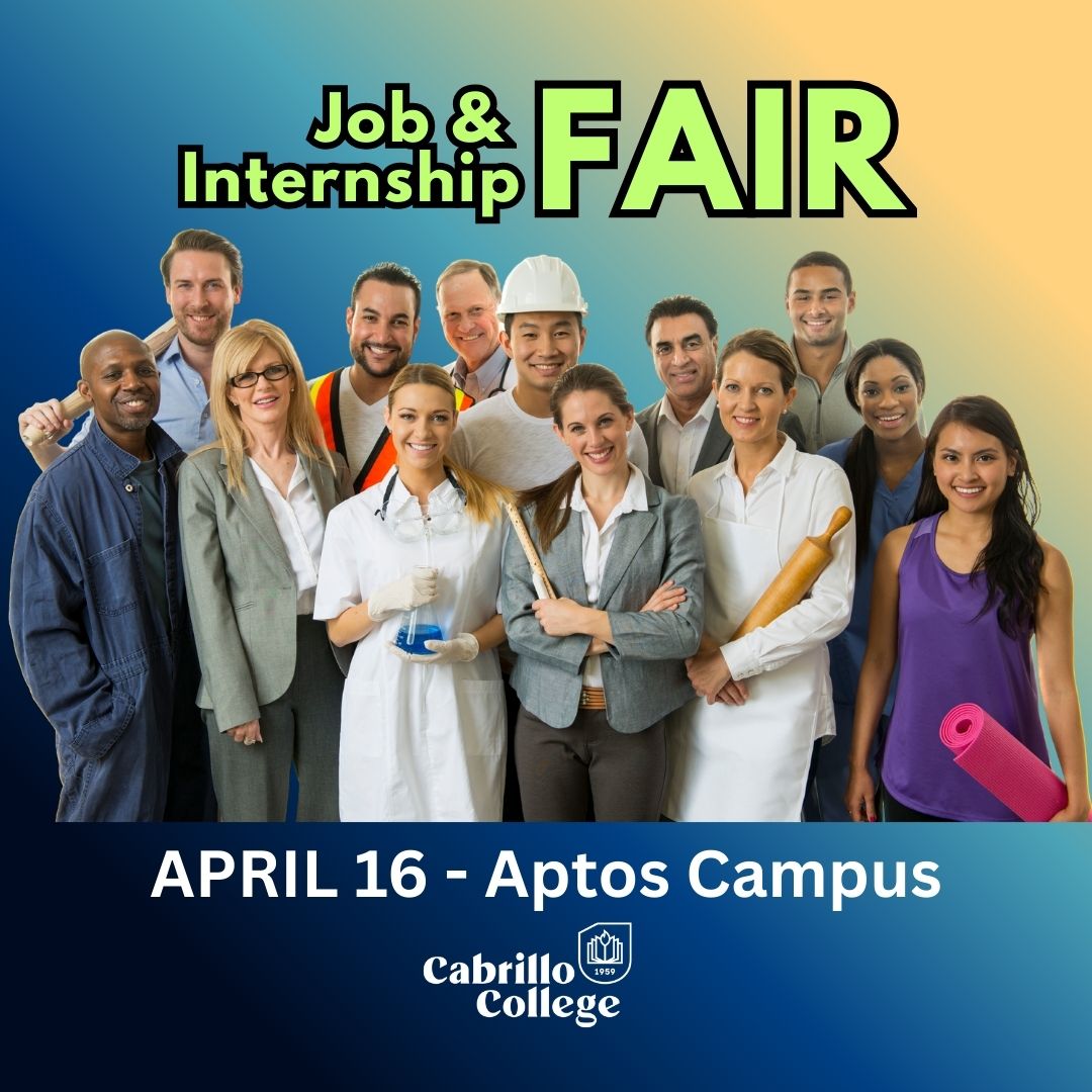 - April 16 10:30AM – 1:00PM Upper Quad Aptos CampusAptos Job & Internship Fair